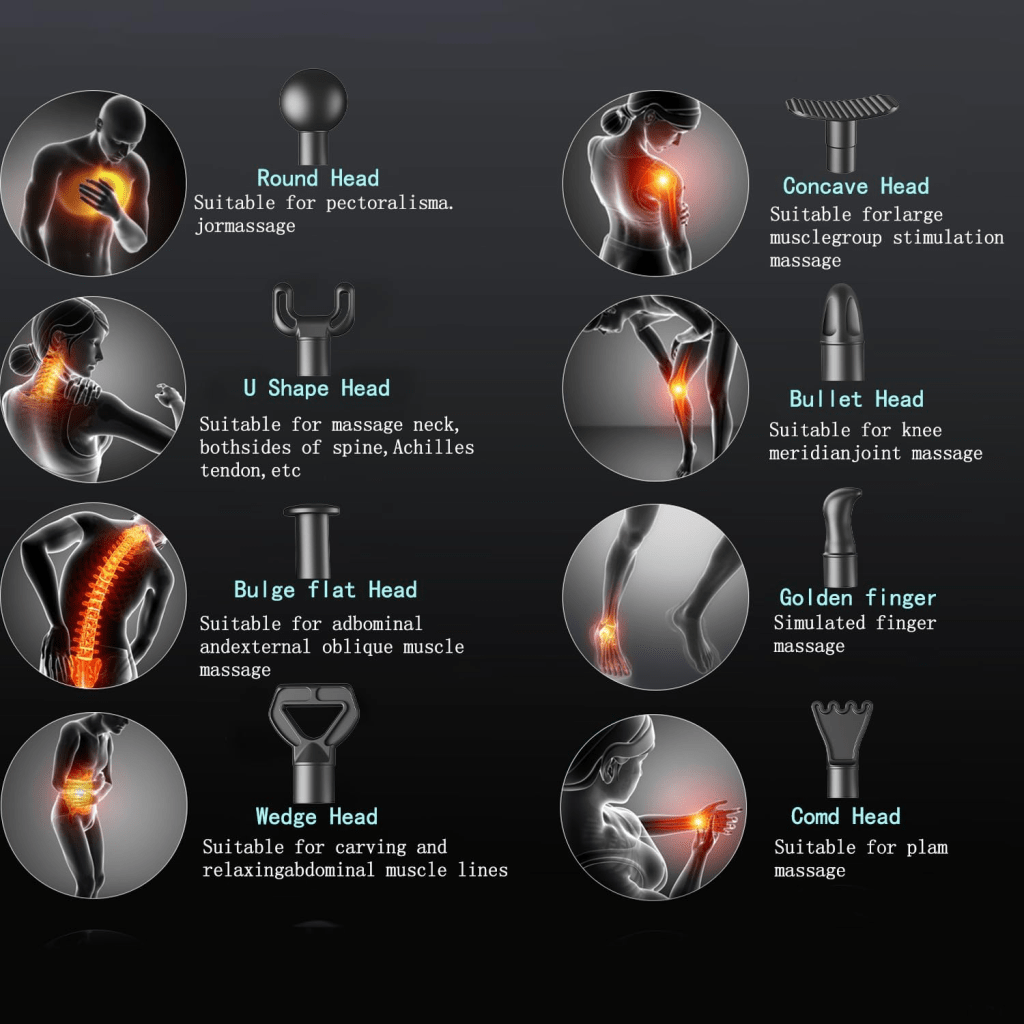 - The eight attachments aren’t just for show — each one has its own function. I use the round head for larger muscle groups like quads and hamstrings, and the bullet head for trigger points around my shoulders and calves.